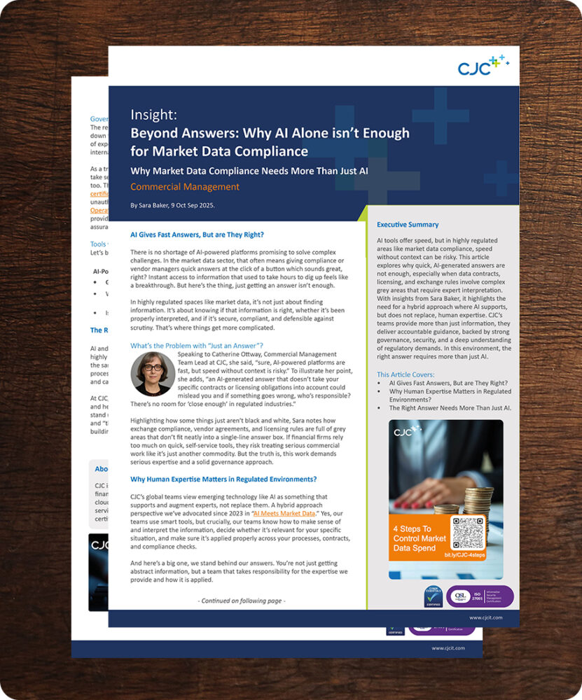AI tools offer speed, but in highly regulated areas like market data compliance, speed without context can be risky. This article explores why quick, AI-generated answers are not enough, especially when data contracts, licensing, and exchange rules involve complex grey areas that require expert interpretation. With insights from Sara Baker, it highlights the need for a hybrid approach where AI supports, but does not replace, human expertise. CJC’s teams provide more than just information, they deliver accountable guidance, backed by strong governance, security, and a deep understanding of regulatory demands. In this environment, the right answer requires more than just AI.