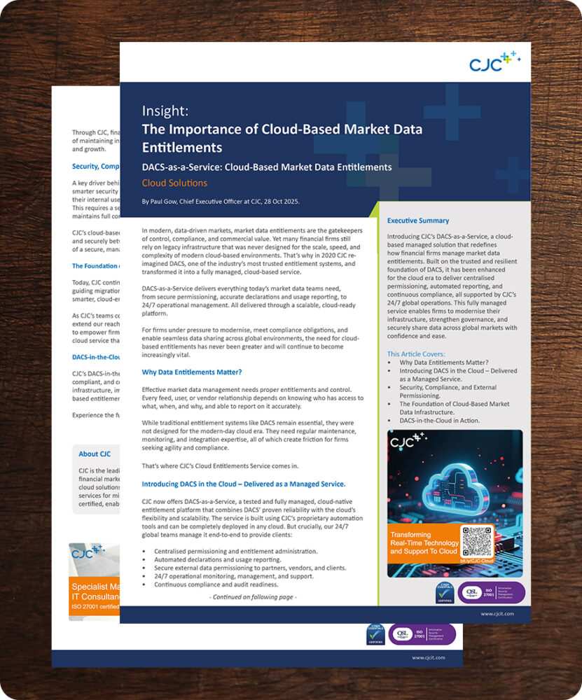 Introducing CJC’s DACS-as-a-Service, a cloud-based managed solution that redefines how financial firms manage market data entitlements. Built on the trusted and resilient foundation of DACS, it has been enhanced for the cloud era to deliver centralised permissioning, automated reporting, and continuous compliance, all supported by CJC’s 24/7 global operations. This fully managed service enables firms to modernise their infrastructure, strengthen governance, and securely share data across global markets with confidence and ease.