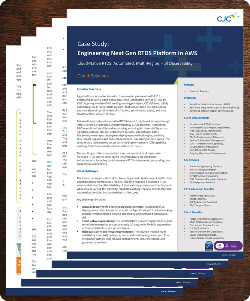 A global financial market infrastructure provider partnered with CJC to design and deliver a cloud‑native Real Time Distribution Service (RTDS) on AWS. Applying modern Platform Engineering principles, CJC delivered a fully automated, multi-region RTDS platform that standardised the provisioning and operation of real-time data distribution, entitlement control, and data transformation services at scale.